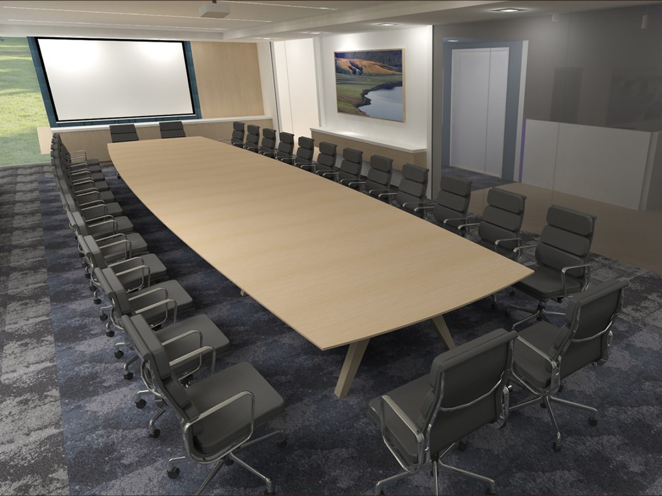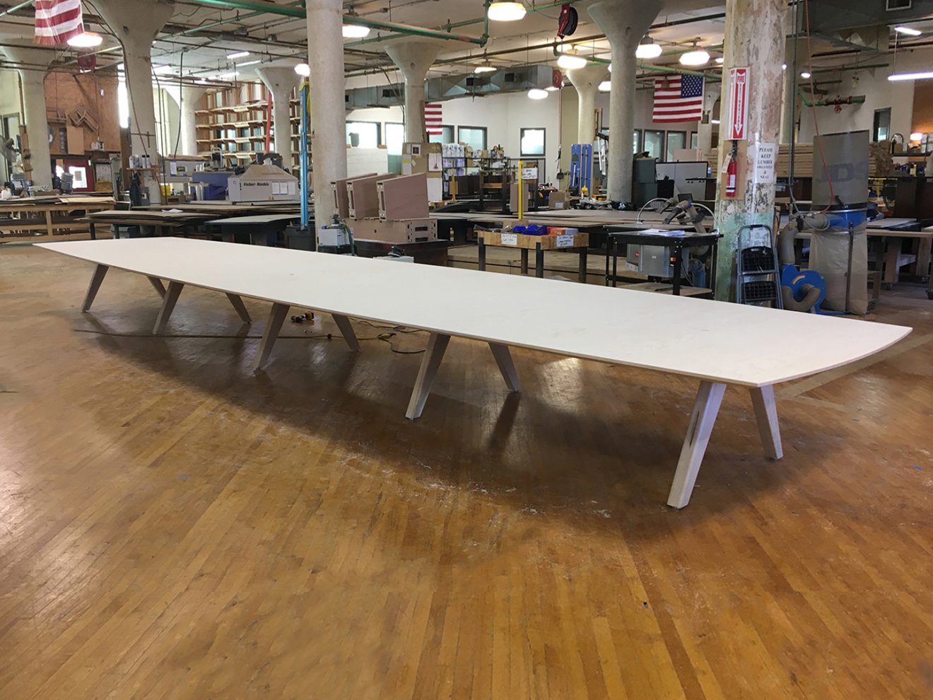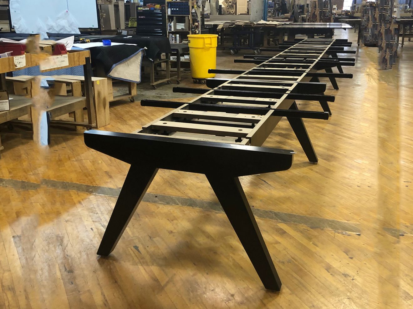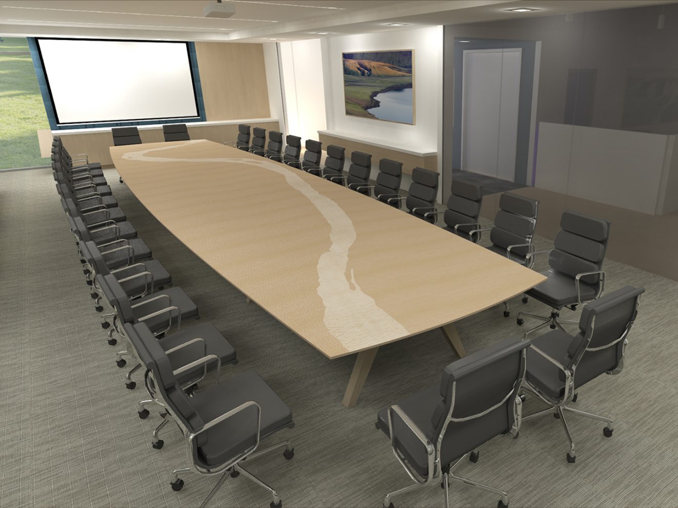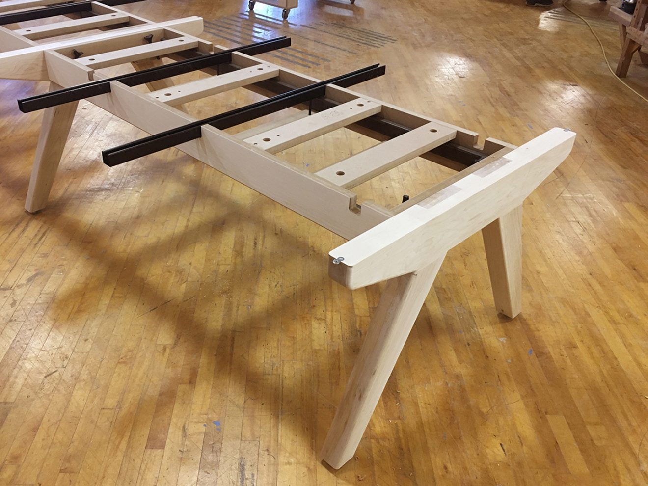 D2 Solutions brought us into their renovation for Graham Partners. This room called for a very simple top: plain hard maple veneers with a solid maple edge. We weren’t told to hold back on the base, though, so we built a custom trestle out of solid maple. Power and data hide under the edge and feed through the legs.